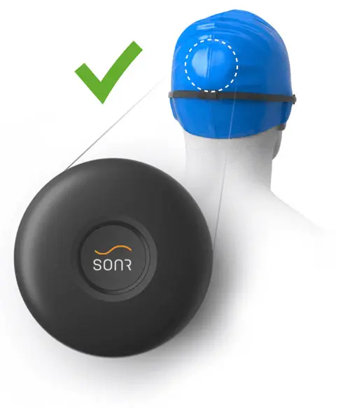 The SONR Music device can be placed anywhere on the swimmer’s head - under a swim cap or attached to goggle straps with the included clip.